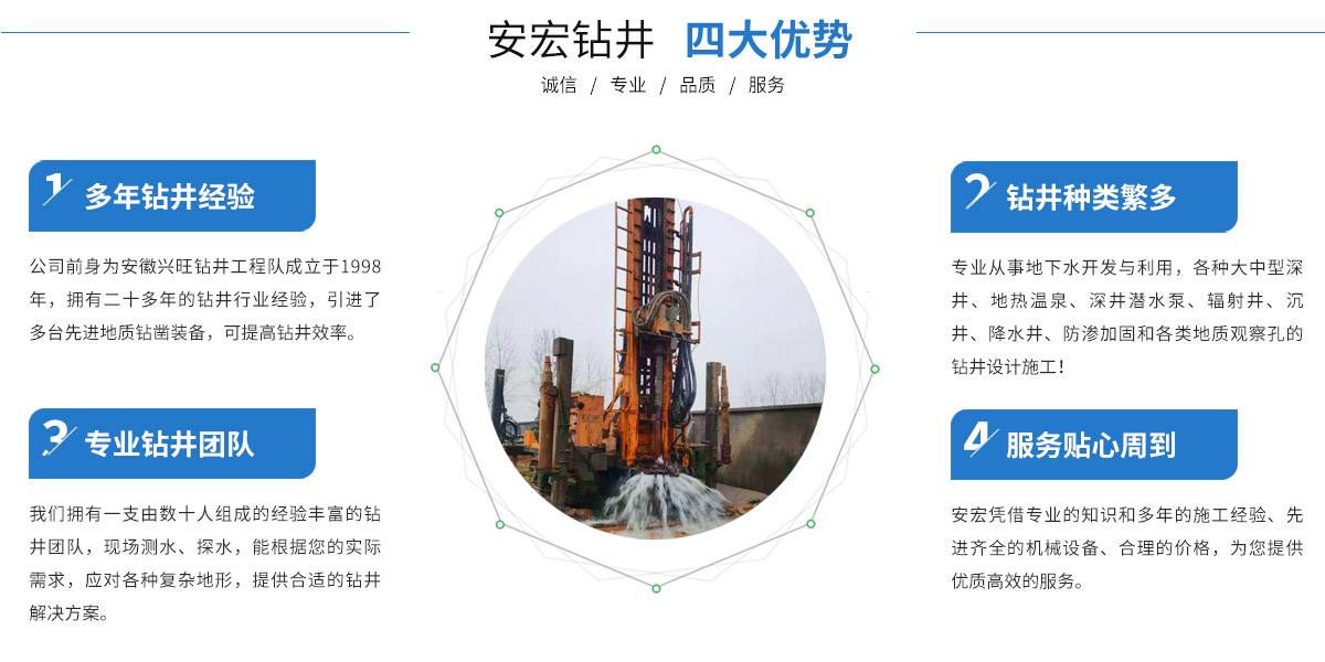 寧國(guó)市安宏鉆井工程有限公司,前為安徽興旺鉆井工程隊(duì)成立于1998年,公司從事安徽鉆井(宣城打井、寧國(guó)打井、蕪湖打井、池州打井、宿州打井、桐城打井、銅陵打井、南陵打井、郎溪打井、廣德打井、績(jī)溪打井、馬鞍山打井等),江蘇鉆井(南京打井、高淳打井...